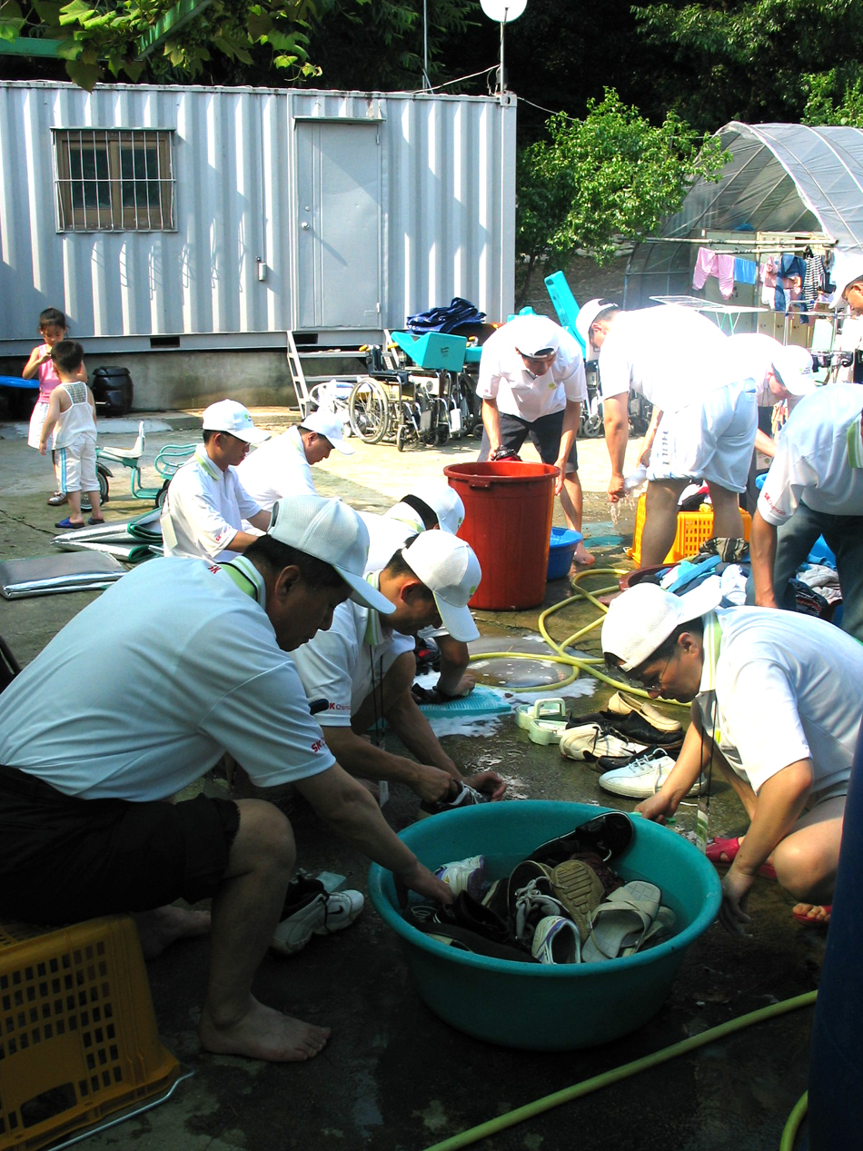 전략세탁팀에 속한 홍지호 사장은 양말을 벗고 수돗가에 앉아 원아들의 때묻은 운동화를 솔로 직접 닫았다. 김경수 반장은 바지마저 벗어 제끼고 연신 빨랫감은 비벼댔다. 한순종 상무는 양동이 물 한 가득 부어 발로 빨랫감을 밟아댔다. 1t 분량의 세탁을 해결한 것 같다.