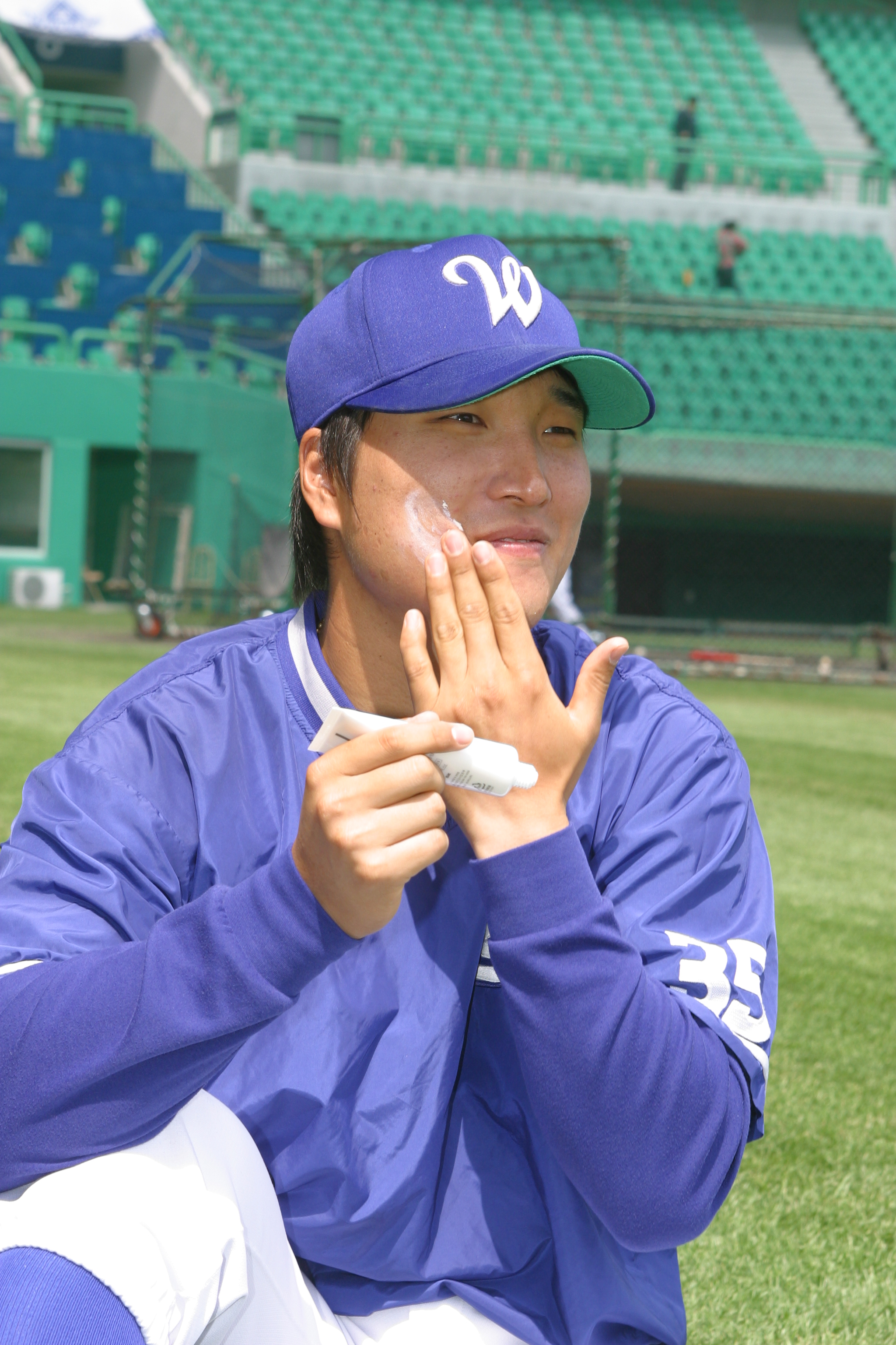SK구단은 직업 특성상 자외선에 심각하게 노출돼 있는 선수들 피부보호를 위해 CARA 자외선 차단제를 사용키로 한 것. 이에 선수들은 연습은 물론 실전에서도 항상 CARA 자외선 차단제를 휴대하며 강력한 자외선 방어에 나서고 있다. (사진: CARA를 바르고 있는 이진영 선수)