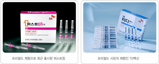 SK케미칼(대표이사 金昌根 부회장)의 최신형 백신제형인 프리필드 시린지(Prefilled Syringe Type) 타입 백신의 누적 생산량이 8월 20일 1,000만개를 돌파했다. [프리필드 시린지 백신]이란 ‘주사기내에 약물이 직접 충전된 형태의 백신’으로 방부제를 사용하지 않고 안전하게 사용할 수 있는 선진국형 백신이다. SK케미칼 백신제제를 생산하고 있는 오산공장은 2005년 국내 최초로 *인플루엔자 백신, *성인용 Td 백신 및 *DPT백신을 프리필드 시린지 타입으로 생산하는 데 성공하였고 2007년에는 *HIB백신(뇌수막염 예방백신 상품명: 퍼스트 힙)의 프리필드 시린지 타입 발매에 성공해 최신형 백신의 국내 보급에 앞장서고 있다.