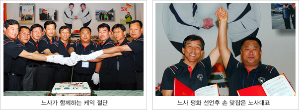 이날 김창근 부회장과 박남식 노조위원장은 노사평화선언에 함께 서명하고 김임섭 울산 지부장, 김억기 부위원장 등 주요 노조 간부와 함께 대형 케익을 절단하며 노사간 화합을 다짐했다.