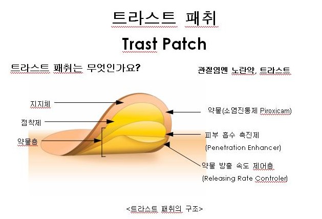 패취란 약물을 지지체에 담아 약물이 필요한 환부(관절, 근육, 허리 등)에 직접 부착하여 약물이 일정 시간 동안 지속적으로 몸속의 필요한 부위에 들어 갈 수 있도록 만든 제제입니다.