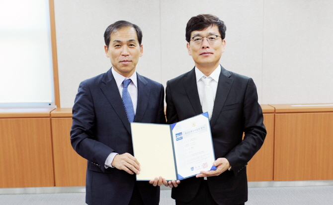 SK chemicals said on October 19 that it won an AA rating from the Korea Customs Service for its AEO award evaluation. SK chemicals Senior Manager Ahn Dong-hyun (right) is receiving the AEO certification from Kim Dae-seop, head of Korea Customs Service Daegu/N. Gyeongsang office
