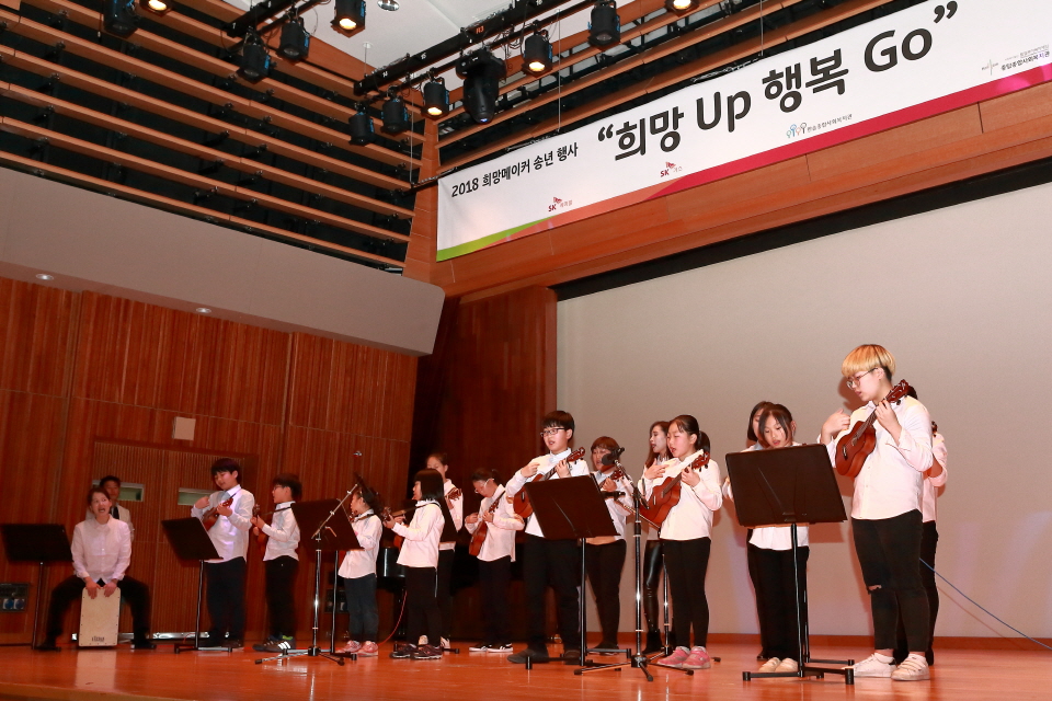 SK구성원들의 선물에 대한 답례로 희망메이커 청소년들은 6개월 간 준비한 방송댄스, 우쿠렐레,바이올린 연주, 사물놀이 등을 선보이며 구성원들에게 감사의 마음을 전했다.